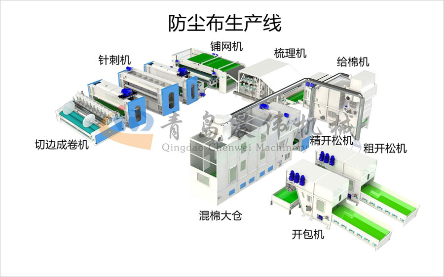 開(kāi)包機(jī)-開(kāi)松機(jī)-振動(dòng)給棉機(jī)-梳理機(jī)-鋪網(wǎng)機(jī)-針刺機(jī)-切邊成卷機(jī)