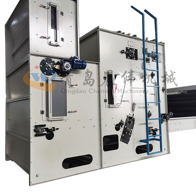 震動(dòng)式給棉機(jī)主要式將經(jīng)過(guò)初步開(kāi)松的纖維集中收集在棉倉(cāng)中,并且鋪成相對(duì)均勻,等厚,等寬的纖維棉層輸送到梳理機(jī)。