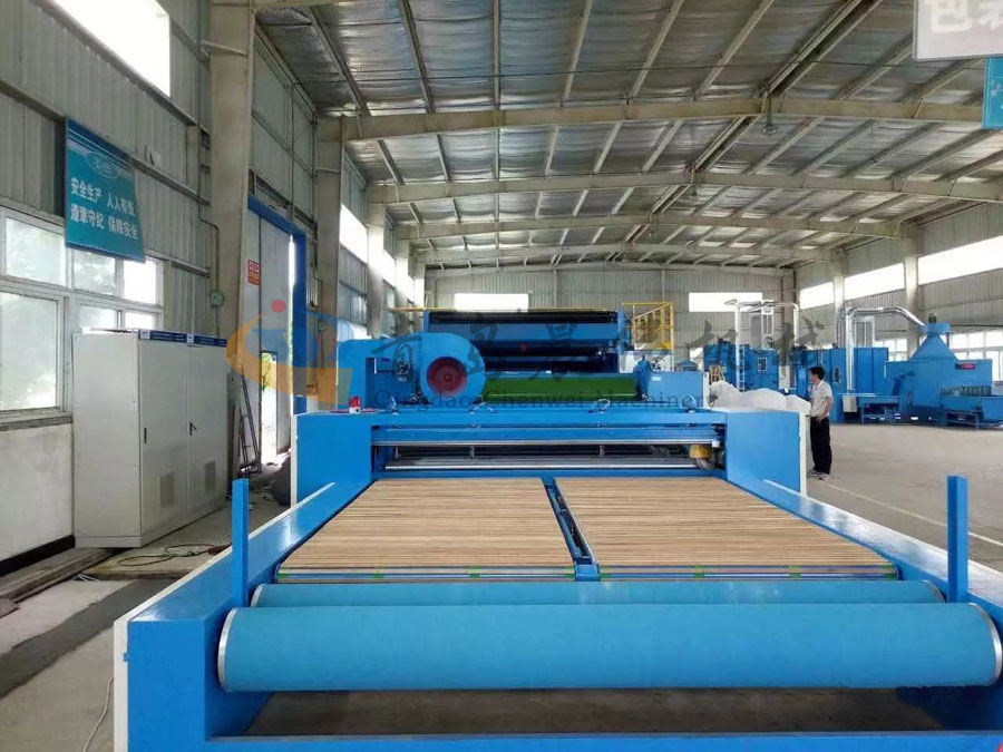 5. CWPW-鋪網(wǎng)機:用于將梳理纖網(wǎng)通過移動小車交叉折疊為所需幅寬和定量的多層纖網(wǎng),以供后道工序使用。鋪網(wǎng)輥采用特殊結(jié)構(gòu),加裝壓網(wǎng)輥和導(dǎo)流板,不飄網(wǎng)不起皺,五只大功率電機精確控制各部件的運動,電動輸出簾高度調(diào)節(jié)裝置